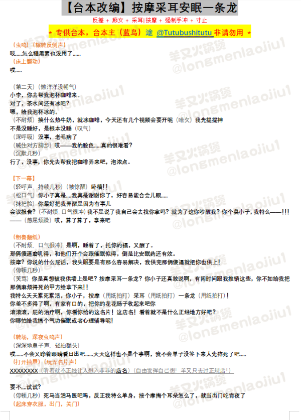 显示源文件过去修订反向链接回到顶部 Share via Share via... Twitter LinkedIn Facebook Pinterest Telegram WhatsApp Yammer Reddit Teams最近更改Send via e-Mail打印Permalink × 这是本文档旧的修订版! 按摩采耳安眠一条龙【专供本】 🚫 简介tag: 反差 + 痴女 + 采耳|按摩 + 强制手冲 + 寸止 作者:羊又火锅煲 署名-非商业性使用: 台本使用声明:录制前请阅读 🦋Twitter/B站:羊又火锅煲 👏🏻👏🏻👏🏻👏🏻欢迎使用,录制前请联系作者获得授权 一爱男喘💙 🦋Twitter主题帖→台本主题帖直通车 ←可戳主题帖浏览 🔼🔼🔼🔼 👆👆👆☝☝👆👆👆 🔼🔼🔼🔼 ©️羊又火锅煲🦋Twitter 编剧/羊又火锅煲/台本改编_按摩采耳安眠一条龙.1674028966.txt.gz 最后更改: 2023/01/18 08:02由 羊又火锅煲