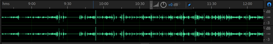 以音量大小、时间为坐标轴 可以通过幅度大小查看音量是否合适,可以看出录音持续时间 也可以看出录音句间停顿部份(0dB,呈直线),并在这基础上进行剪辑切片