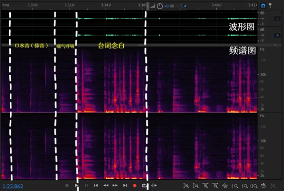不同的声音,频率也有所不同,根据图像我们可以快速定位找到需要的声音 剪辑时如果只看波形图,很容易将多余喘气声剪入,但看频谱图就可以方便定位