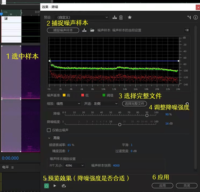 降噪一般只能处理底噪,对杂音作用不大 降噪处理会损伤一定音质,比较微弱的声音在降噪处理后极大可能会失真 前期录制时最好就尽量避免杂音、噪音(如空调、风扇声等) 录制时请在开头录制几秒钟的无人声环境音,便于后续操作