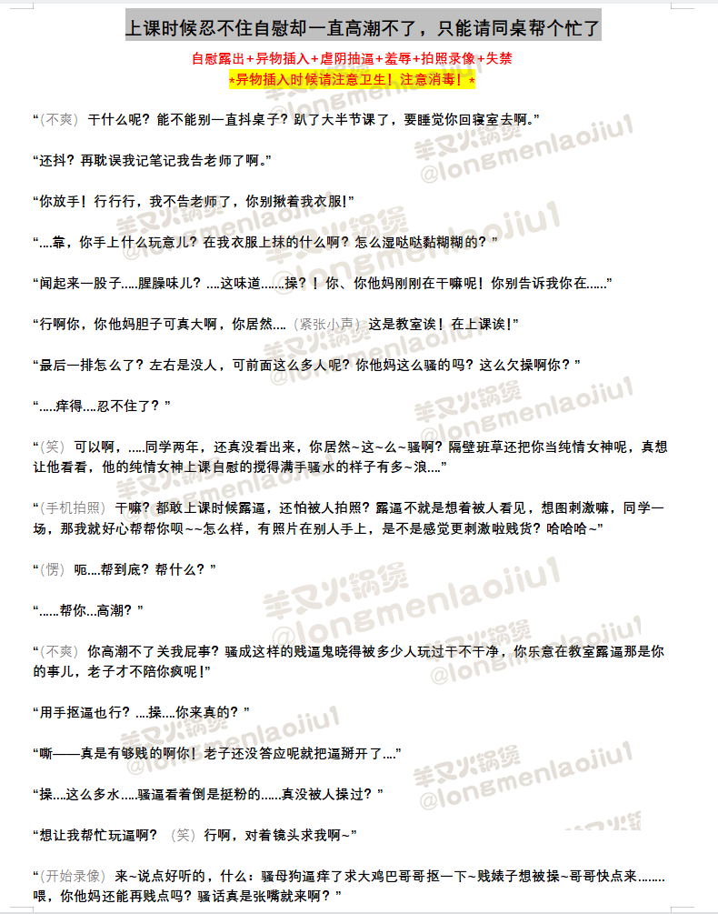 显示源文件过去修订反向链接回到顶部 Share via Share via... Twitter LinkedIn Facebook Pinterest Telegram WhatsApp Yammer Reddit Teams最近更改Send via e-Mail打印Permalink × 这是本文档旧的修订版! 上课时候忍不住自慰却一直高潮不了,只能请同桌帮个忙了 简介tag: 自慰露出 X 异物插入 X 虐阴抽逼 X 羞辱 X 拍照录像 X 失禁 作者:羊又火锅煲 署名-非商业性使用: 台本使用声明:录制前请阅读 🦋Twitter/B站:羊又火锅煲 👏🏻👏🏻👏🏻👏🏻欢迎使用,录制前请联系作者获得授权 一爱男喘💙 🦋Twitter主题帖→台本主题帖直通车 ←可戳主题帖浏览 🔼🔼🔼🔼 👆👆👆☝☝👆👆👆 🔼🔼🔼🔼 ©️羊又火锅煲🦋Twitter 编剧/羊又火锅煲/同学_帮个忙.1671348579.txt.gz 最后更改: 2022/12/18 07:29由 羊又火锅煲