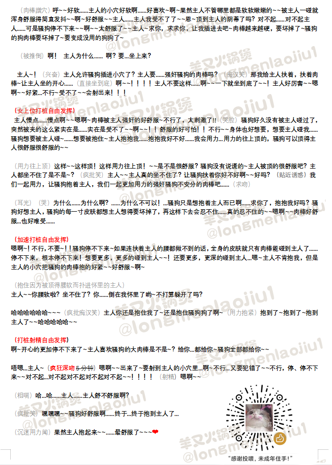 显示源文件过去修订反向链接回到顶部 Share via Share via... Twitter LinkedIn Facebook Pinterest Telegram WhatsApp Yammer Reddit Teams最近更改Send via e-Mail打印Permalink × 这是本文档旧的修订版! 我可以抱你吗...... 简介tag: 疯批痴汉抖M+女dom+肌肤饥渴症+ 阴茎锁+物品抚慰 + 舔穴蹭穴+女上位 作者:羊又火锅煲 署名-非商业性使用: 台本使用声明:录制前请阅读 🦋Twitter/B站:羊又火锅煲 👏🏻👏🏻👏🏻👏🏻欢迎使用,录制前请联系作者获得授权 一爱男喘💙 🦋Twitter主题帖→台本主题帖直通车 ←可戳主题帖浏览 🔼🔼🔼🔼 👆👆👆☝☝👆👆👆 🔼🔼🔼🔼 ©️羊又火锅煲🦋Twitter 编剧/羊又火锅煲/我可以抱你吗.1671348864.txt.gz 最后更改: 2022/12/18 07:34由 羊又火锅煲